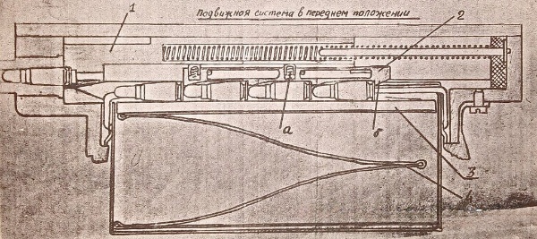 Оружие с магазином конструкции Зубкова функционировало следующим образом. Досылание патрона затвором «1» в патронник осуществлялась из ближайшего (переднего) к казённому срезу ствола ряда патронов в магазине. При этом одновременно с досыланием переднего патрона соединённые с затвором две подпружиненные гребёнки «2» сдвигали вперёд все остальные в ряду патроны на один шаг. Таким образом, на место досланного в ствол патрона становился новый патрон, ранее стоявший позади него.
