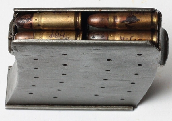 Магазин с патронами присоединялся к оружию снизу и крепился в нём подпружиненной защёлкой.