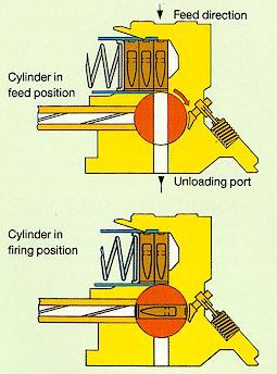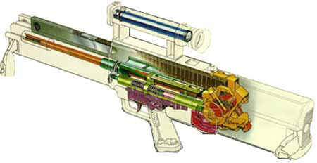 Ствол, ударно-спусковой механизм (за исключением предохранителя/переводчика и спускового крючка), поворотный патронник с механикой и магазин смонтированы на едином основании(лафетная схема), которое может двигаться назад и вперед внутри корпуса винтовки. При стрельбе одиночными или длинными очередями весь механизм совершает полный цикл отката-наката после каждого выстрела, чем обеспечивается снижение отдачи (аналогично артиллерийским системам). При стрельбе очередями в три выстрела подача патрона и его выстреливание производятся сразу же после предыдущего, с темпом до 2000 выстрелов в минуту, в процессе отката стреляющего блока. При этом вся подвижная система приходит в крайне заднее положение уже ПОСЛЕ третьего выстрела, при этом отдача начинает действовать на оружие и стрелка опять таки уже после завершения очереди, чем обеспечивается чрезвычайно высокая кучность стрельбы (похожее решение использовано в советском/российском автомате АН-94 «Абакан»).