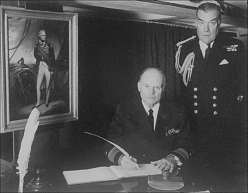 А в 1956 году до британских спецслужб наконец дошло, что все эти годы их водили за нос. 1 апреля катера были переданы в состав только что созданного Бундесмарине, послужив началом эскадры Шнелльботов. С особой благодарностью Первого морского лорда и главнокомандующего Королевским флотом Мунтбеттена Клозе попрощался с британской службой. Вот немец расписывается в гостевой книге исторического корабля британского флота «Виктори» по случаю своего выхода на пенсию 30 сентября 1978 года в присутствии адмирала сэра Дэвида Уильямса: