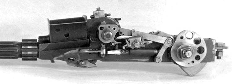 При дальнейшем повороте колодки коленчатый рычажок действует на длинное плечо коромысла и выводит его зуб из сцепления с тягой 7, которая под действием пружин 3 прижимается к кулачку. Таким образом, пока на нажимную колодку будет действовать приложенная сила, пулемёт будет стрелять.