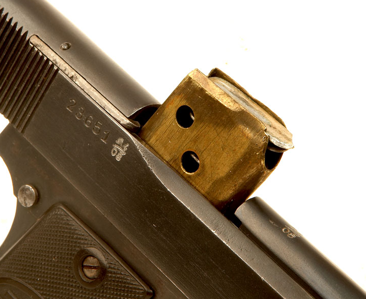 Еще один любопытный момент конструкции, и далее сохраненный — то, что пистолет использовал отъемный магазин, которым оружие снаряжалось сверху при открытом затворе, а не снизу рукояти — новый магазин, вставляемый в пистолет, одновременно выталкивал пустой вниз. Полностью скрытый в рукояти подпружиненный фиксатор с верхним скосом других вариантов не предполагал чисто физически.