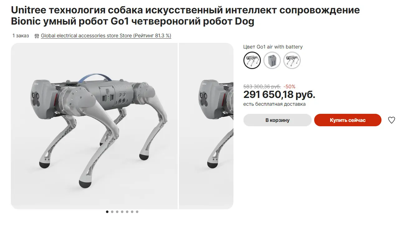 Очень похоже на то, что не имеющая аналогов «российская разработка» это роботизированный пес от китайской компании Unitree Robotics. На «AliExpress» этот робот продается по цене не миллион рублей, а 3730 долларов, но на прямую, у компании, его можно приобрести всего за 2500 долларов. Возможно, что присутствовавшие на выставке «Армия-2022» потенциальные покупатели оружия именно так и поступят, не связываясь с российскими перекупщиками.