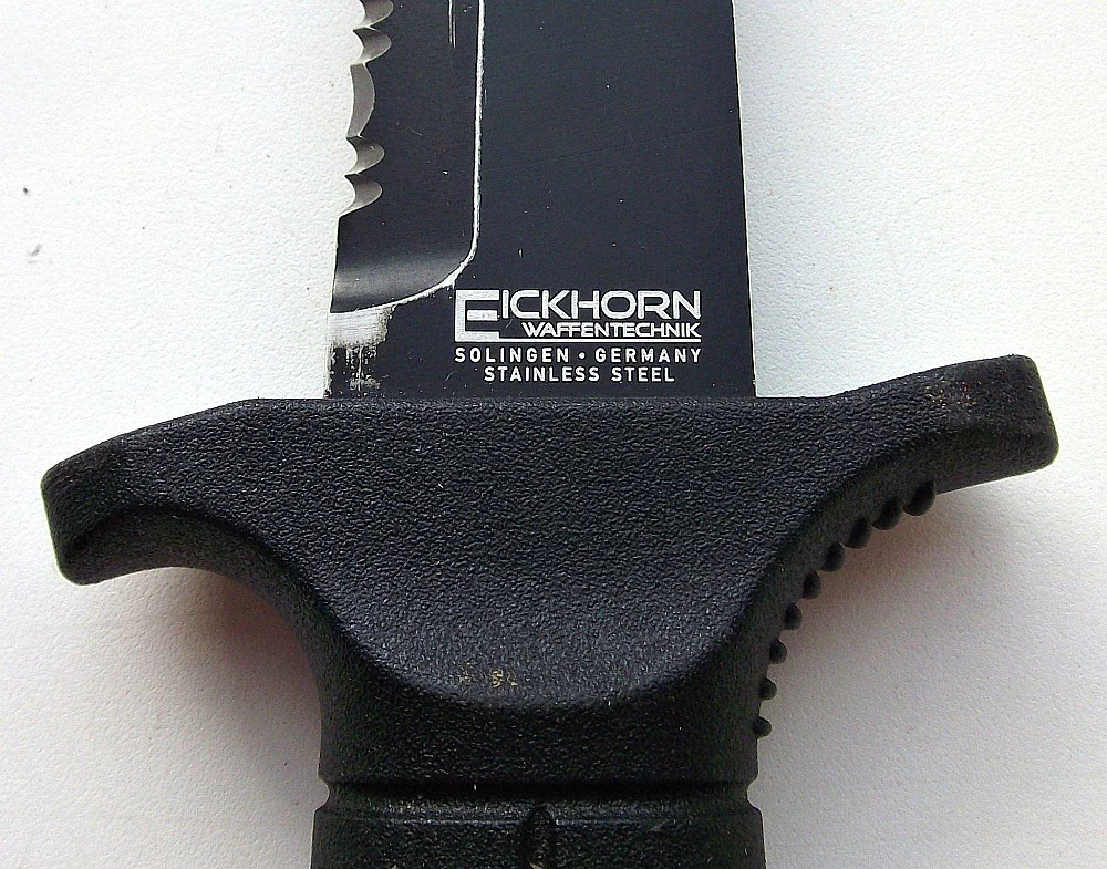 Сама гарда небольшаякак и рукоять. Выполнены как одно целое. Изготавливаются из армированного стекловолокном полиамида черного цвета, с использованием метода литья вокруг зауженного хвостовика клинка. Для большей прочности идет фиксация рукояти винтом. Гарда S-образной формы, с отогнутым в сторону рукояти нижним концом. Такой ход сделан для лучшей фиксации указательного пальца руки.