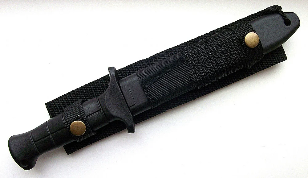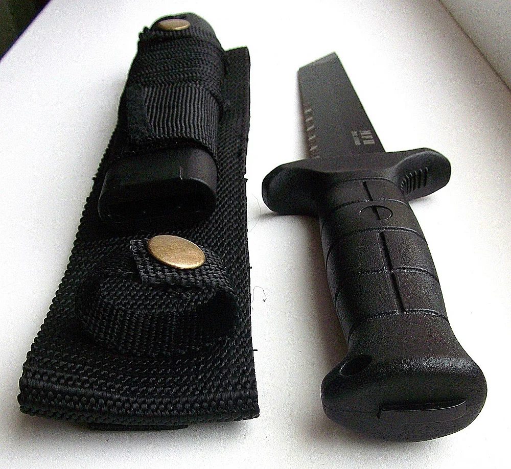 Ножны небольшие и компактные. Изготовлены из того же материала, что и сама рукоять ножа. Кстати говоря, их дизайн очень схож с дизайном немецких штык-ножей времен Второй Мировой. Система подвеса из ткани «Кордура«. Она дает возможность крепить нож на поясном ремне и на разгрузочных жилетах Бундесвера.