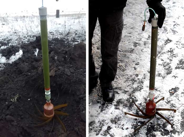 В более твердых грунтах и при глубине промерзания более 0,4 м для образования воронки необходимых размеров последовательно применяются два заряда. Взрывать заряды ОЗ-1 на мерзлых торфянистых грунтах не рекомендуется, так как фугасный заряд погружается в грунт на значительную глубину и при его взрыве может образоваться камуфлет с выпучиванием мерзлого слоя грунта, без образования воронки.