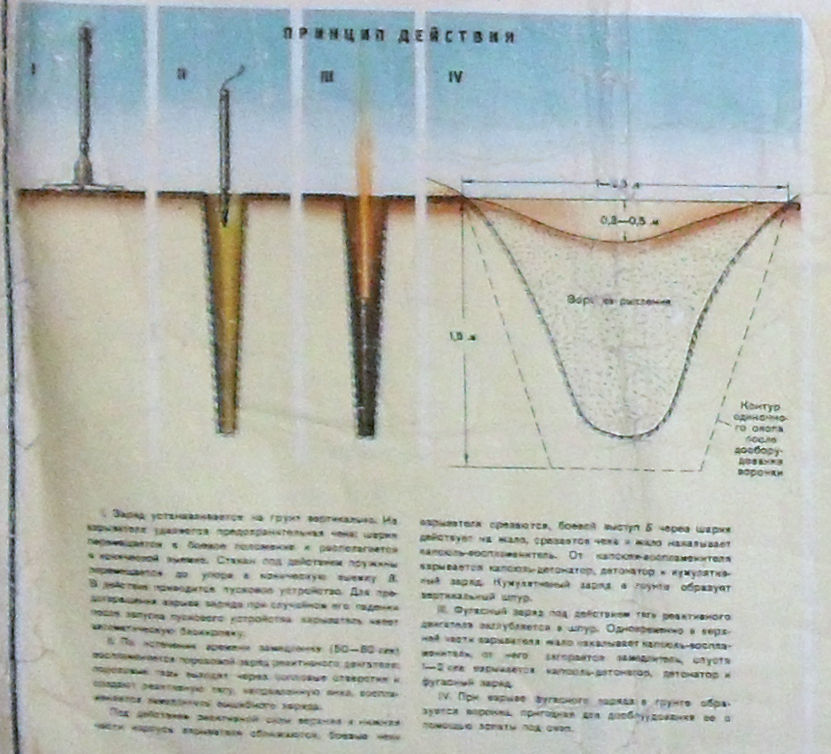 От луча огня взрывается капсюль-детонатор, от него — детонатор и затем кумулятивный заряд. Кумулятивная струя, образовавшаяся при взрыве кумулятивного заряда, пробивает в грунте шпур. Фугасный заряд, продолжая движение вниз под действием реактивной тяги, входит в пробитый шпур. После сгорания пиротехнического замедлителя в расширительной камере (замедлитель горит 0,5-0,9 с) воспламеняется вышибной пороховой заряд.