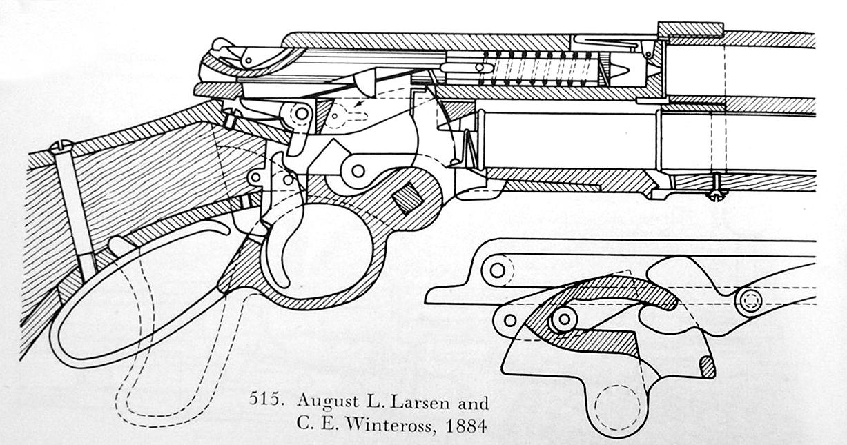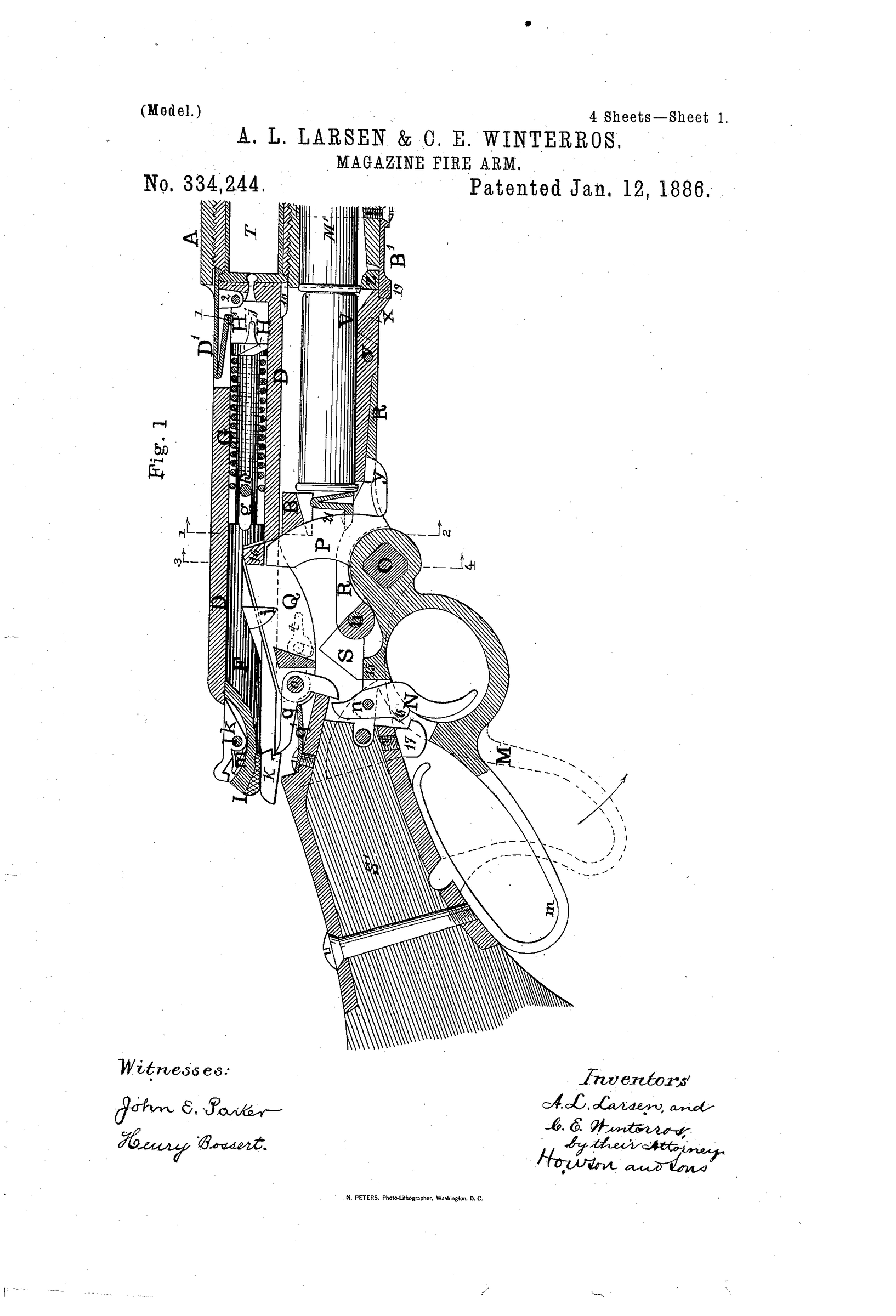 Отслужив в Трондхеймской бригаде в чине секонд-лейтенанта (в то время — аналог звания унтер-офицера в шведской армии), Ларсен ушел на «гражданку», и, опираясь на фирму своего отца (бельгийский филиал появился аккурат в это время), сам занялся разработкой оружия совместно со своим товарищем, Класом Эриком Винтерросом из Стокгольма. В промежутке с 1883 года по 1886-й они последовательно получали патенты на свое ружье со скобой Генри и подствольным магазином сначала в Европе, затем и в США, так что приоритет в сравнении с Браунингом имели однозначный.