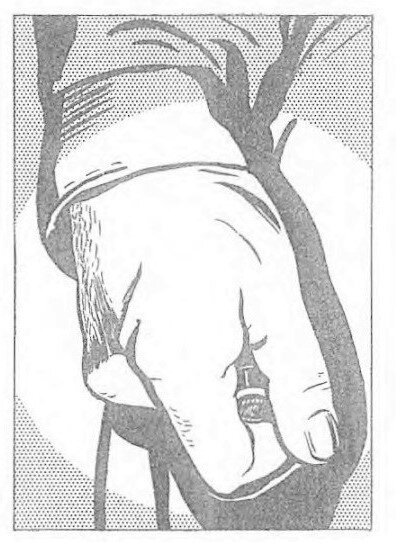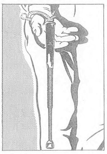 «Оружие готово к действию, рукоять-трубка и шнур в рукаве. Набалдашник виден, но не зажат».