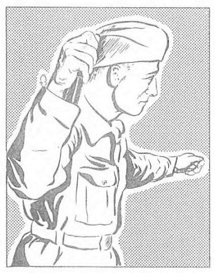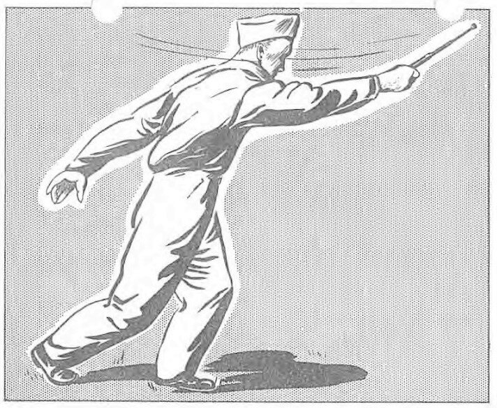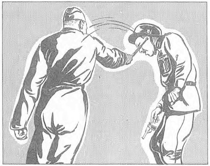 «АТАКУЮЩИЙ НАПРАВЛЯЕТ удар в висок, выполняя его с плеча, как при быстром бейсбольном броске. Полностью выдвинутая дубинка достаточно длинна и гибка для того, чтобы, если ее опустить на голову противника сверху и сзади, рукоять выйдет за край его шлема и ударит его по лицу или шее».