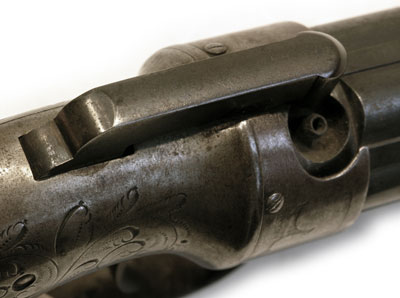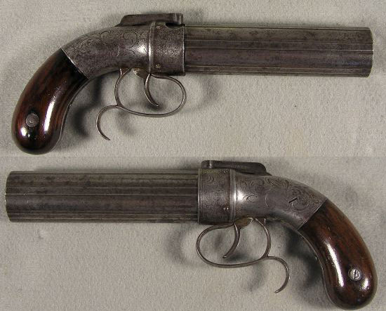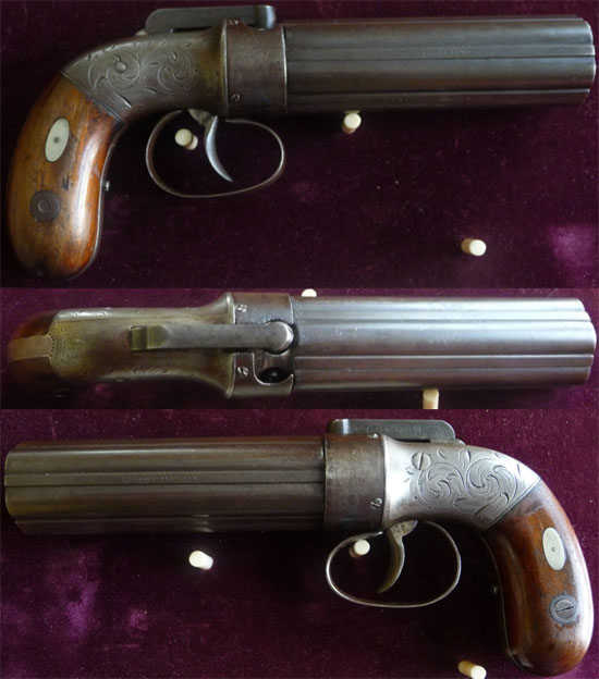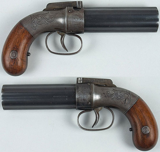 Это оружие, производившееся в Америке, имеет капсюльный замок с двойным действием. Поворот стволов и взвод курка осуществляется спусковым крючком.
