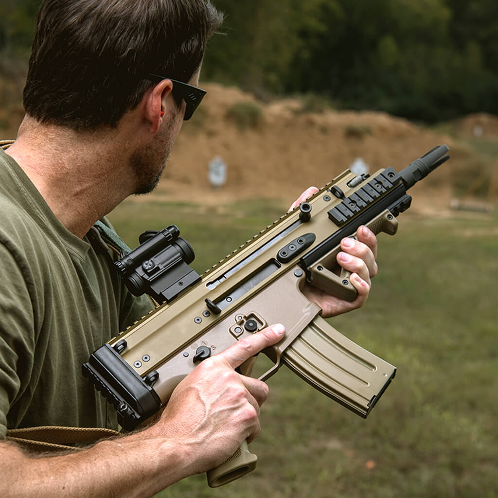 FN SCAR 15P, наряду со своими более крупными братьями, теперь работает с рукоятками без возвратно-поступательного движения (NRCH), которые можно перемещать на любую сторону оружия или использовать полностью двухсторонний вариант.