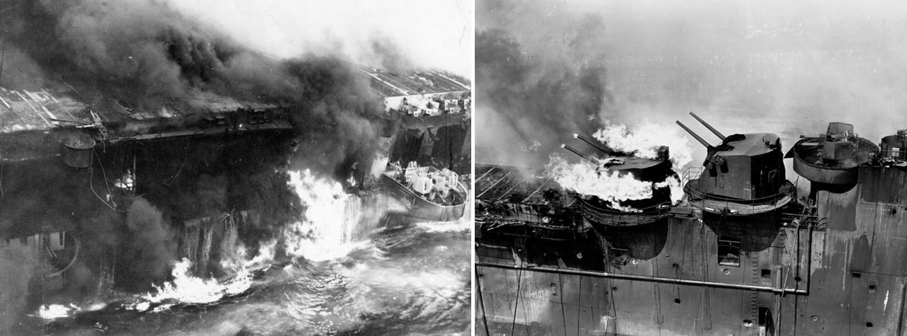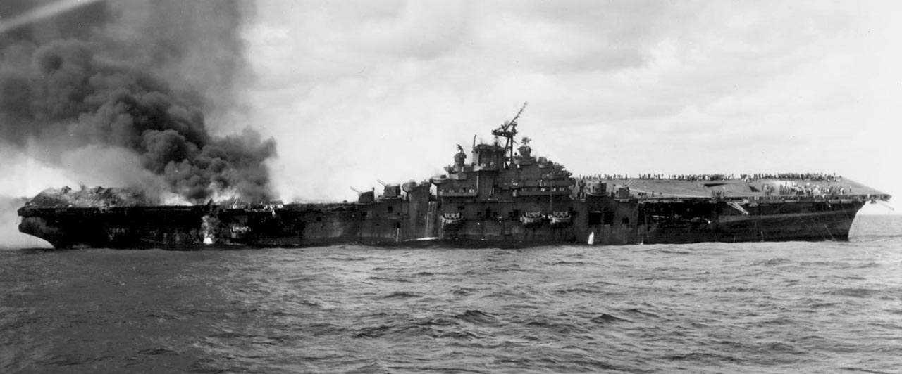 Потрясшая авианосец серия взрывов была такой разрушительной силы, что из нескольких сотен матросов, летчиков и авиатехников, находившихся в момент катастрофы на ангарной палубе, выжили только двое. Уцелевшие моряки, считая, что корабль обречен, начали десятками прыгать в воду, но одновременно другие, более храбрые, вступили в борьбу с огнем.