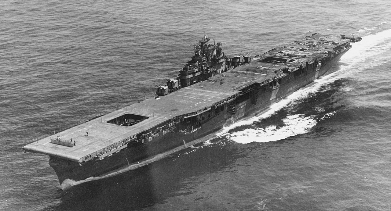 Бомба пробила верхнюю палубу и взорвалась на ангарной, где в это время готовили самолеты к боевому вылету. 30 штурмовиков и истребителей-бомбардировщиков были уже заправлены, а под 16 из них — подвешены авиабомбы и ракеты «Тини-Тим». От взрыва всё это начало детонировать по цепочке, потом рванули цистерны с авиационным бензином и боеприпасы, сложенные на палубе.