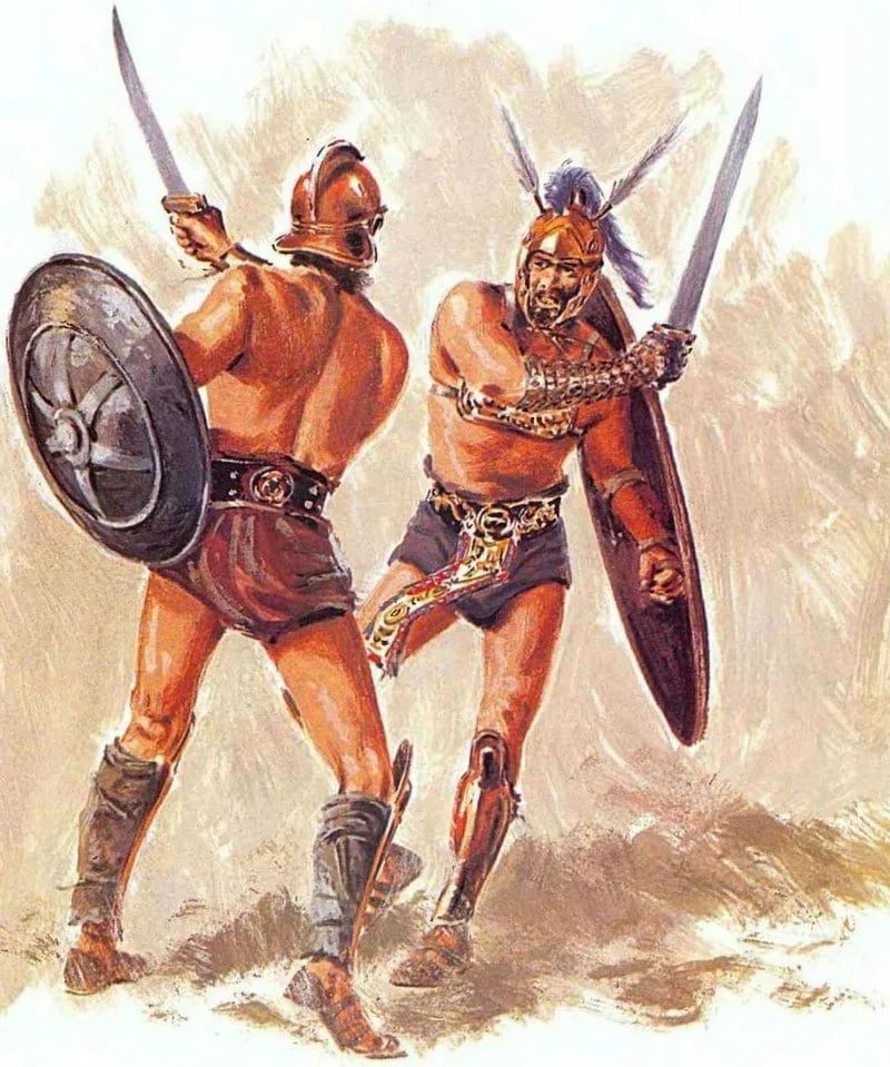 Изначально это был вообще не римский обычай, а кампанский — племен, живших на юге Италии, в области Кампания. Один из первых, если не самый первый случай упоминания гладиаторов — это 308 год до н.э., когда римляне со своими союзниками-кампанцами праздновали победу над племенем самнитов. Именно союзники тогда вывели на арены гладиаторов в самнитских доспехах и заставили их драться между собой. тогда же, судя по всему, и появился самый древний класс гладиаторов — самнит.
