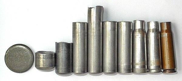 Далее – материал гильзы. Самый лучший вариант известен уже давно – это латунь. Прочная, пластичная, легко обрабатывается, хорошо держит давление – в общем, всем хороший материал, только вот есть пара недостатков: требует больших затрат цветных металлов, ну и дорогая это зараза. Тем не менее, очень долгое время выбора не было, найти замену латуни не получалось. Само собой, никто на токарниках гильзы не точит, их вытягивают из заготовки, придают форму, подрезают, и только в конце идёт токарная обработка и сверление. Вытягивать гильзу из латунного блинчика – это одно, тут можно справиться небольшим прессом чуть ли не настольного класса, в гараже уж точно сделать можно. Сталь же – совсем другое дело, тут оборудование нужно более серьёзное, да и с самой сталью всё гораздо сложнее, какая попало сыромятина не подойдёт, нужны специальные сорта, дающие оптимальное сочетание пластичности и прочности.