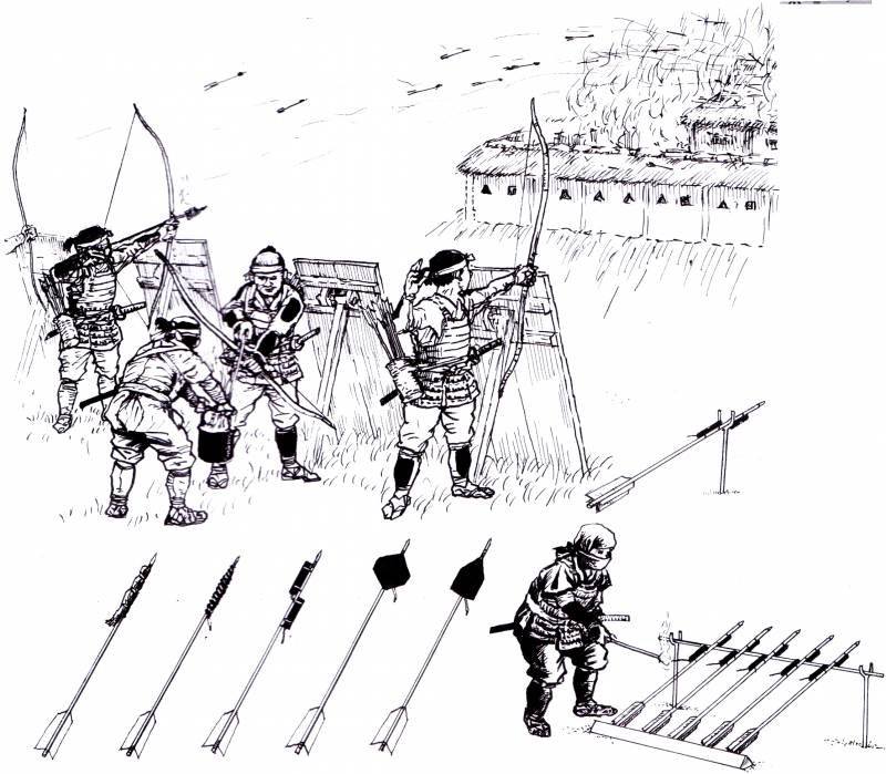Надо сказать, что японские лучники широко применяли различные виды зажигательных стрел, прежде всего, потому, что имели возможность разложить их и приготовить, находясь под прикрытием татэ. Использовались как стрелы, просто обмотанные паклей, пропитанной каким-нибудь маслом, так и настоящие «реактивные снаряды» с пороховыми ускорителями в виде отрезков труб из бамбука, набитых пороховой мягкостью. Трубок было две. Одна с отверстием сзади использовалась как реактивный двигатель, тогда как другая, с отверстием, обращенным вперед, поджигалась фитилем уже после того, как стрела попадала в цель и работала в качестве огнемета.