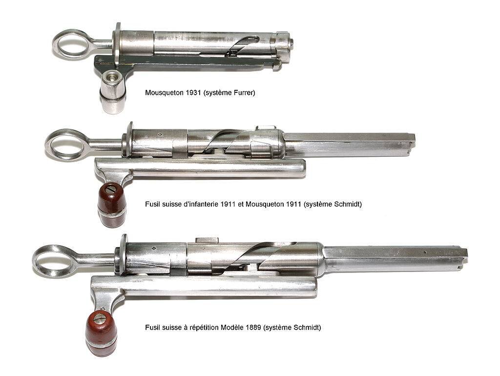 Запирание ствола осуществлялось на два боевых упора, расположенных в его передней части. Это усовершенствование, позволившее заметно уменьшить длину затвора (длину ствольной коробки и длину винтовки в целом), предложил небезызвестный Адольф Фуррер.