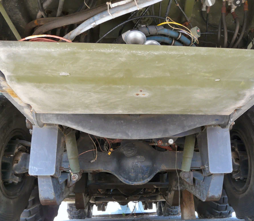 Но опять же, проблема в том, что сама пневмоподвеска сделана неудачно. Так можно видеть низко свисающие элементы, которые постоянно за что-то цеплялись. Тягач просто застревал в песках и увязал на слабо несущих грунтах. И поэтому от такого мобильного наземного пускового комплекса решили отказаться.
