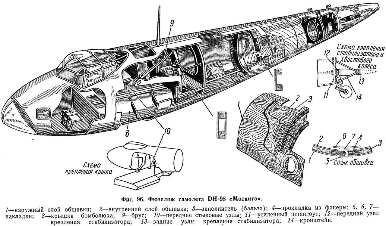 Из балинита была выполнена силовая обшивка крыла, стабилизатора и киля «Москито», а обшивка фюзеляжа представляла собой клееный «бутерброд» из двух листов тонкой дельта-древесины с вклеенной между ними тем же бакелитом слоем легкой бальзы. По удельной прочности такая конструкция превосходила дюраль, но без бальзы и синтетической смолы она была невозможна. К слову, в СССР во время войны не имелось ни того, ни другого (бакелит тогда в СССР не выпускали/советская химическая промышленность была весьма отсталой/, а тропическое бальзовое дерево, как известно, в СССР не расло).