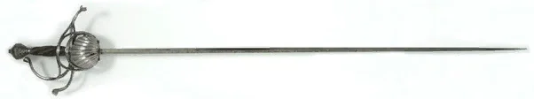 Исторически — абсолютно реальный объект. Хранится в британском Музее Фитц-Уильяма. Полная длина — 1380 мм, клинка — 1150 мм. Масса не указана, но я рискну предположить — что-то в пределах 800-900 г. Эфес у него довольно тяжелый, а клинок легонький.