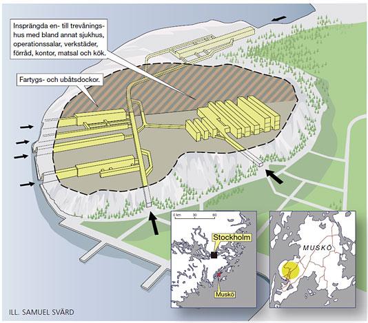 В 1950 г. появился доклад, согласно которому новый объект следовало развернуть на о. Мускё на юге Стокгольмского архипелага. Вскоре утвердили проект, согласно которому на Мускё следовало построить подземные судостроительные и судоремонтные предприятия. Собственно база флота должна была появиться позже – для сокращения затрат в первые годы строительства.