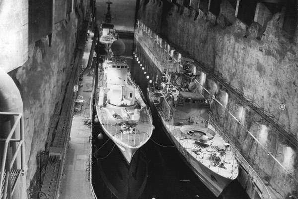 В дальнейшем проект несколько раз пересматривался, но строительство продолжалось. В 1950-55 гг. строители пробили первые тоннели, пригодные для принятия малых и средних кораблей. В 1955-м тральщик HMS M14 впервые вошел в подземный тоннель и встал у причала.