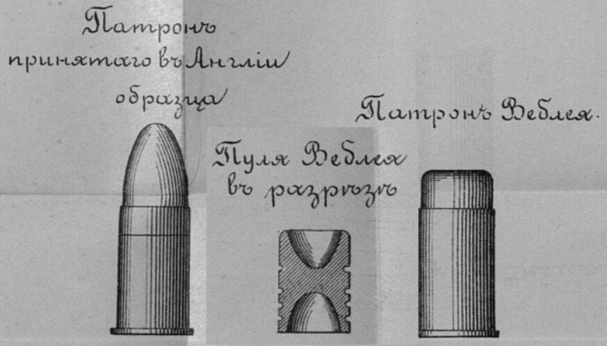 Что касается английских патронов, то, как было упомянуто выше, в России в 1901 году были испытаны два образца: стандартный патрон .455 Веблей Мк.II (11,55х19,3 мм R) и т.н. «останавливающий человека» .455 Веблей Мк.III. Первый именовался «патроном принятого в Англии образца», второй — «специальным патроном Веблея».