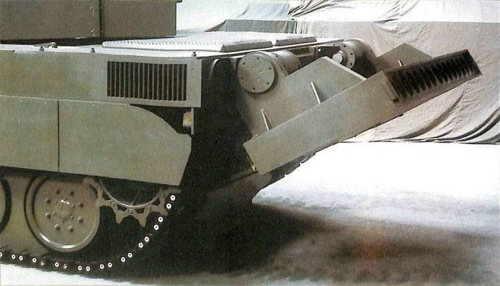 На корме танка предлагалось шарнирно закреплять П-образную конструкцию, вероятно с противопульным бронированием. Поперечная деталь представляла собой ящик с 15 ячейками под унитарные 120-мм выстрелы. При помощи опор она присоединялась к шарнирам на корпусе танка и могла занимать два основных положения. На нижней части П-образного устройства предусматривались крепления для бочек с горючим.