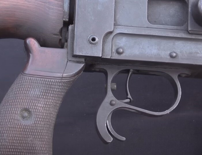 К пистолетной рукояти (к нижней части спусковой скобы) был перенесен и предохранитель, который представлял собой рычаг, в ненажатом состоянии блокирующий спусковой крючок.