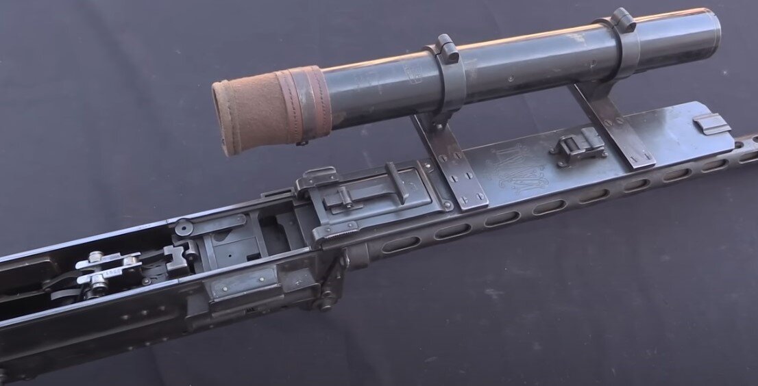 Кроме того, возвратная пружина, которая у пулемета Максима и пулемета Виккерс находилась под характерно выступающей крышкой с левой стороны ствольной коробки, была перенесена в приклад.
