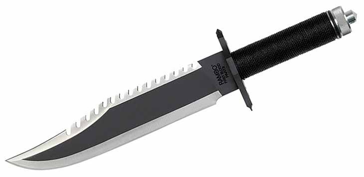 Клинок ножа Rambo First Blood Part II имеет форму в классическом стиле Боуи с односторонней заточкой, благодаря чему нож одинаково хорошо режет и колет, а увеличенная масса клинка позволяет достаточно эффективно использовать нож и для нанесения рубящих ударов. На обухе и его скосе сохранена пилообразная нарезка с очень крупными зубьями. Клинок изготовлен из нержавеющей стали 420-12. Защитное покрытие нанесено таким образом, что лезвие и пилообразная нарезка остаются без покрытия. Концы массивной стальной гарды-крестовины могут использоваться в качестве отвертки.