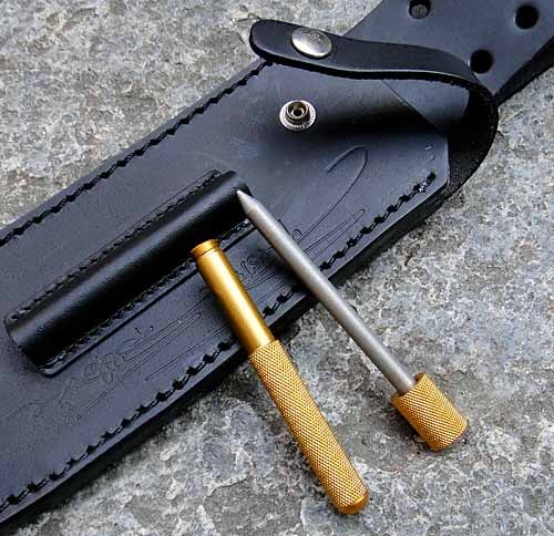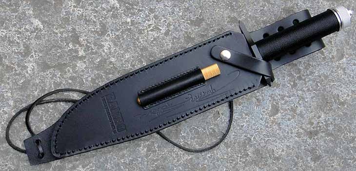 Ножны выполнены из кожи, снабжены ремешком для фиксации рукоятки, петлей для подвески на поясном ремне и шнуром для крепления на бедре. В ножнах размещен алмазный точильный камень.