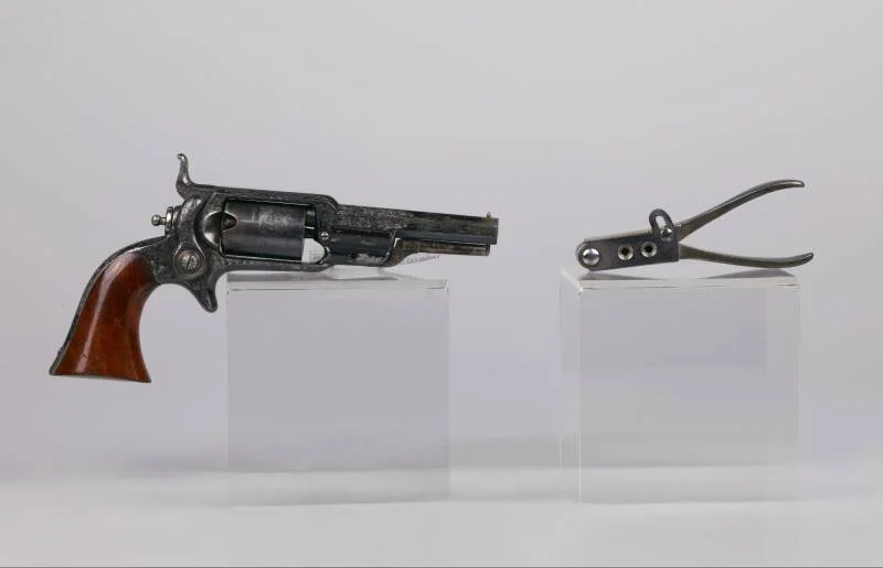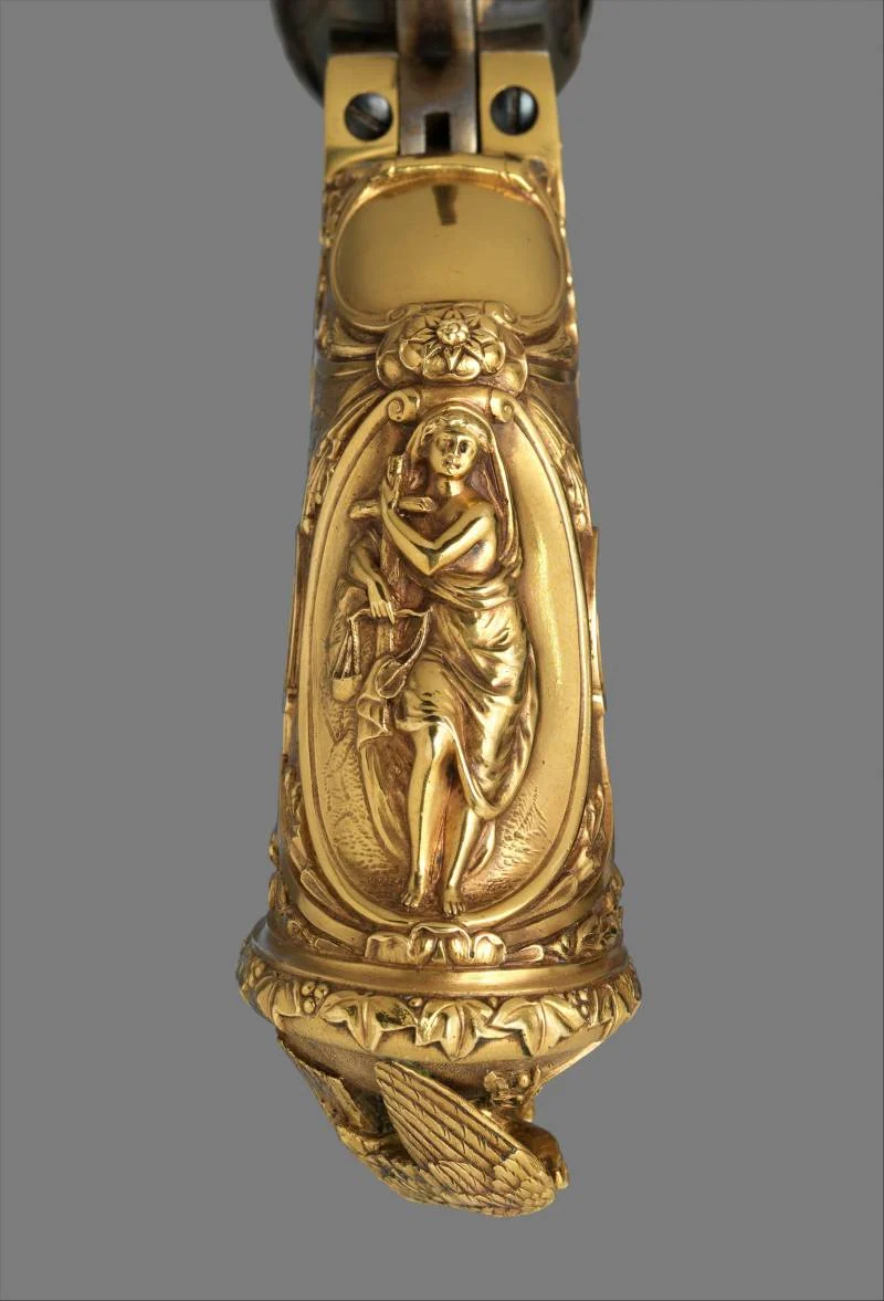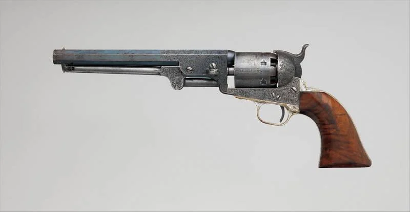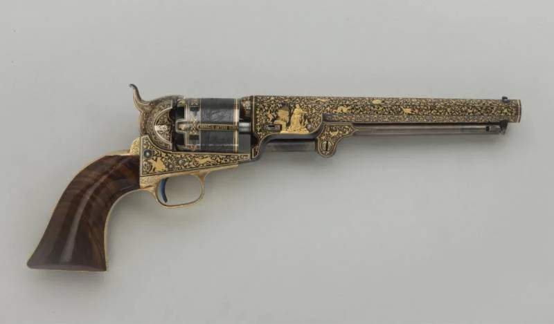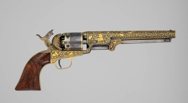 Кстати, карманный револьвер модели 1849, представленный в 1848 году и остававшийся в производстве до 1872 года, был одним из самых популярных видов огнестрельного оружия Кольта, а произведен он был в количестве более 300 000 экземпляров. Доступный с четырех-, пяти- или шестидюймовым стволом, его небольшой размер делал его практичным оружием для самообороны. Этот револьвер – один из четырех инкрустированных золотом револьверов Кольта в коллекции Метролитен-музея.