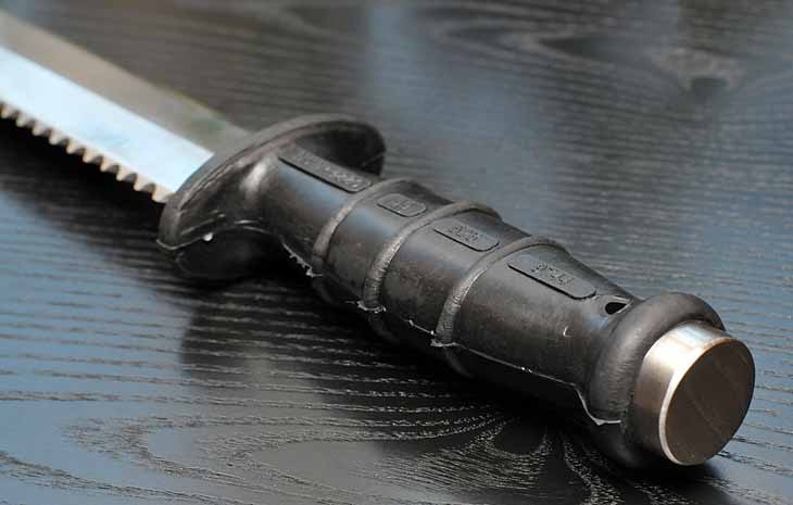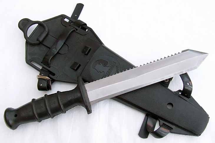 Заточка ножа односторонняя. На обухе выполнена дополнительная пилообразная насечка для резки канатов, сетей и тому подобного. Прочный кончик клинка копьевидной формы можно использовать в качестве рычага.