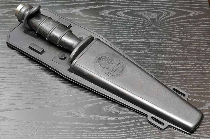 Нож комплектуется ножнами из черной твердой резины с подвесной системой для крепления на ноге аквалангиста или на его снаряжении.