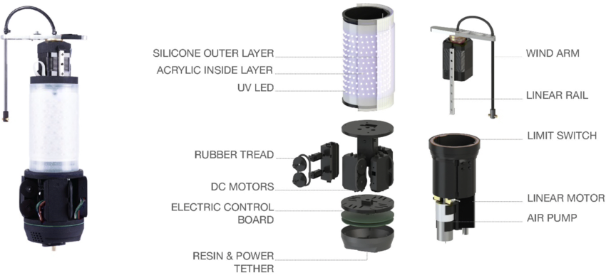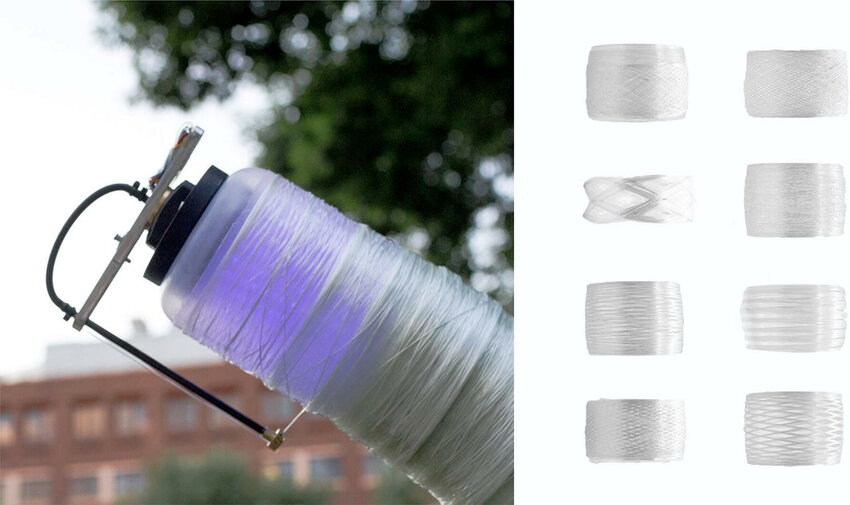Fiberbots хоть и не похож на паука, но выполняет аналогичную работу – обматывает, будто жертву, основание детали тонкой стекловолоконной нитью. Она поступает вместе с клейкой смолой, чтобы сразу формировать устойчивую плетеную структуру, причем узор плетения может весьма разниться. Когда слой готов, робот спускает мембрану, из которой сделано основание, перемещает себя на конец детали, надувает мембрану и начинает ткать новый участок, который представляет собой единое целое с предыдущим.