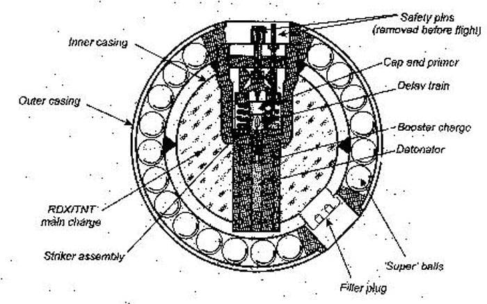 Боевая часть бомбы, отвечающая за поражение целей, должна была представлять собой металлическую сферу, заполненную взрывчатым веществом и оснащенную взрывателем с замедлением. Поверх основного корпуса, дробящегося на осколки, следовало помещать более крупную тонкую сферу. Пространство между двумя корпусами планировалось заполнить резиновыми шариками достаточного диаметра. Петтер-Боуэр, Дензил и Бев полагали, что сферическая бомба после сброса с самолета будет терять скорость и лететь по пологой траектории. Упав на землю, изделие должно было отскакивать от нее и вновь подлетать вверх. Для более эффективного «отражения» от поверхности между корпусами располагались упругие шары. Только после подъема на некоторую высоту должен был происходить подрыв. За время падения и отскока бомбы носитель успевал уйти на безопасное расстояние.