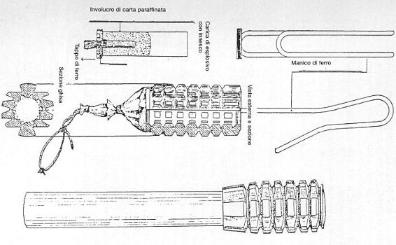 Снизу и сверху корпус закрыт пробками из чугуна, ввинчивающимися на резьбе. Одна из пробок имеет отверстие под запал, другая же имеет несколько отверстий для крепления проволочной или деревянной рукоятки.