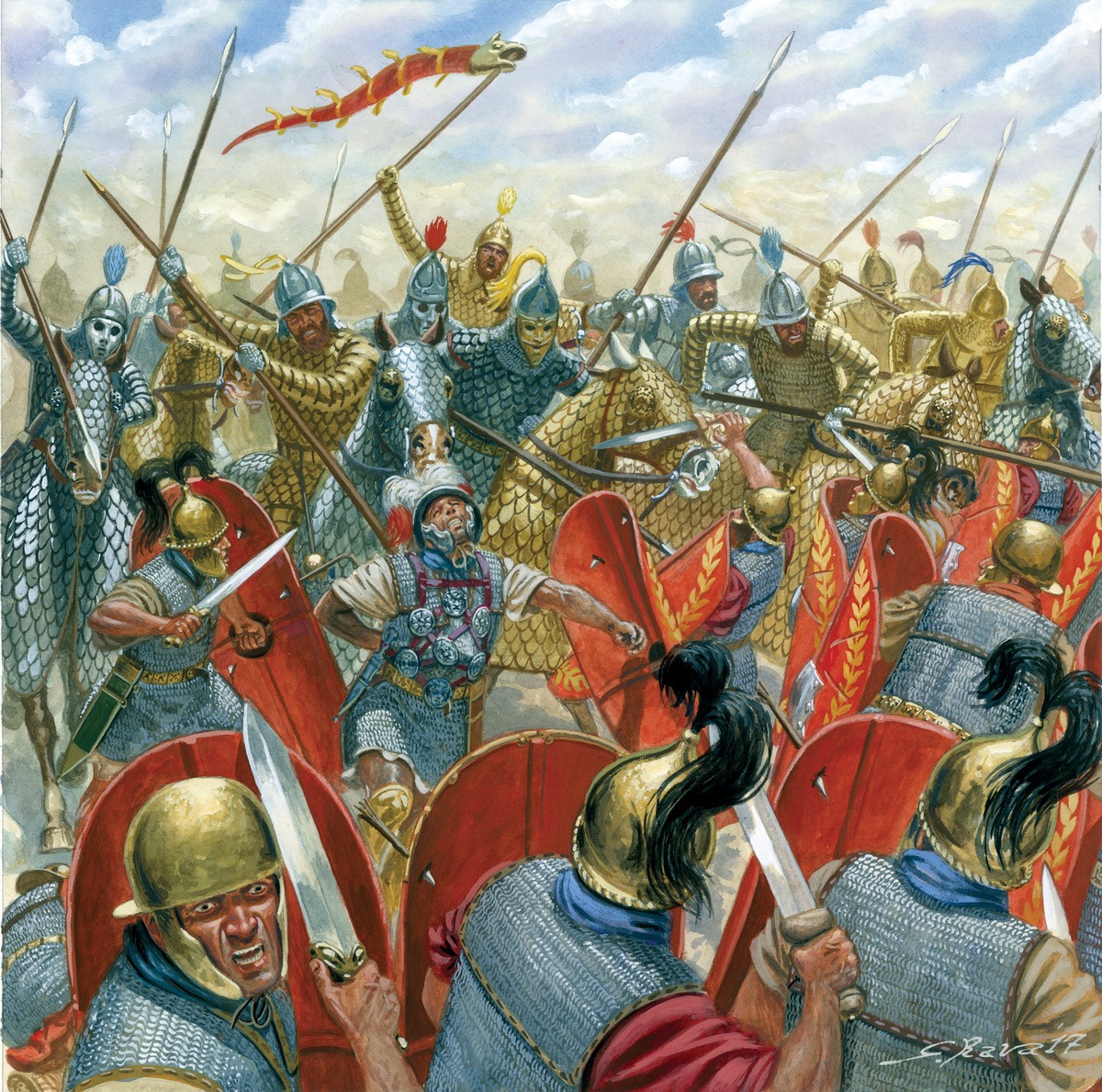 «Они предстали перед римлянами в шлемах и латах из ослепительно сверкавшей брони, а кони их — в латах бронзовых и железных», — так писал Плутарх о появлении тяжелой парфянской конницы в сражении при Каррах в 53 году до нашей эры. Похожее описание встречается у Ксенофонта, который лично видел всадников Кира Младшего. При этом между трудами Плутарха и Ксенофонта временной промежуток в 400 лет.