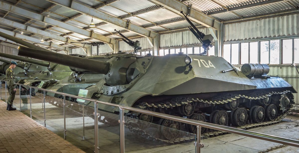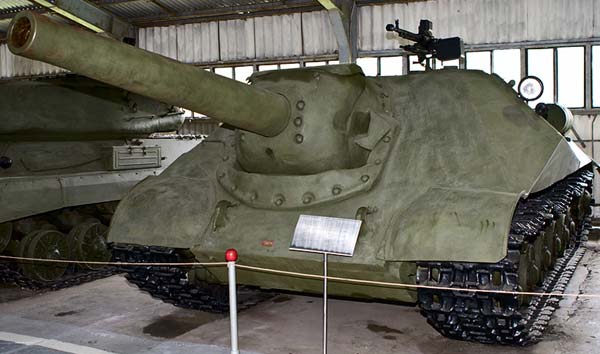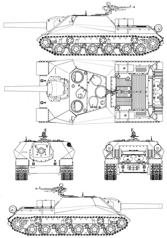 Броневая защита сварных корпуса и рубки — противоснарядная, изготовленная из катаных броневых листов толщиной 20, 30, 60, 90 и 120 мм. Верхний лобовой броневой лист толщиной 120 мм был общим для корпуса и броневой рубки и имел угол наклона 50° от вертикали. Нижний лобовой лист имел такие» же толщину и угол наклона. 11ижние бортовые листы броневой рубки толщиной 90 мм имели обратные углы наклона 45°. Уровень броневой защиты бортов корпуса машины был таким же, как у танка ИС-3, Верхний кормовой лист толщиной 60 мм располагался под углом 40″ от вертикали, нижний — 75 мм под углом 60°. В откидной части верхнего кормового листа для доступа к агрегатам трансмиссии имелись два люка, закрывавшиеся откидными броневыми крышками на петлях. Днище и крыша машины имели толщину брони 20 мм. Над входными и выходными отверстиями для охлаждающего воздуха в крыше моторного отделения были установлены броневые решетки.