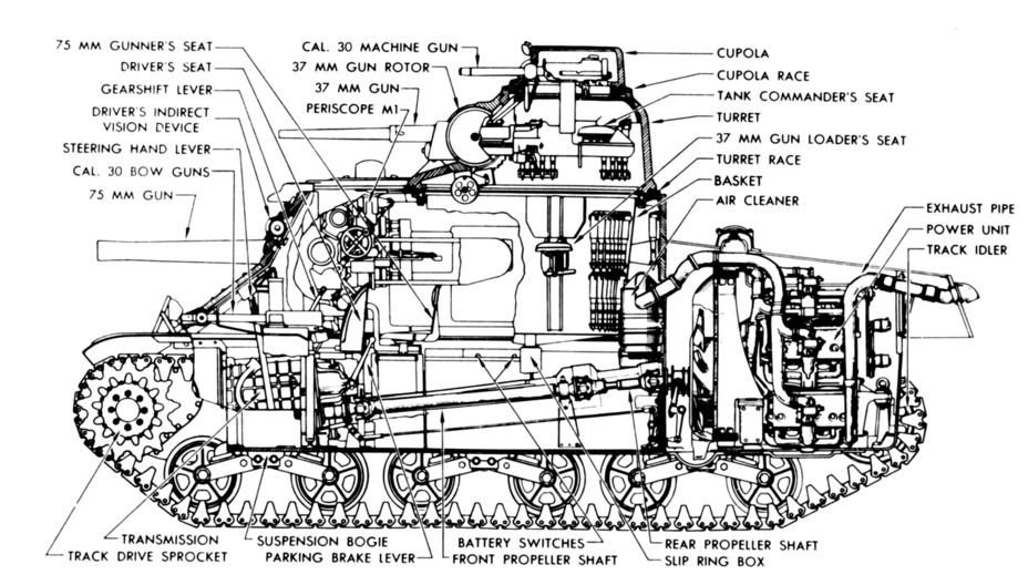 Как уже говорилось, под башней находилось трое человек: командир, наводчик и заряжающий. Впереди располагались места механика-водителя и радиста. Как и на Medium Tank M2/M2A1, вал от двигателя к коробке передач проходил между ног механика-водителя. Разумеется, вал был прикрыт кожухом, но ощущения от того, что под тобой проворачиваются три с половиной сотни лошадиных сил, весьма специфические. Острыми ощущениями конструкторы не обделили и радиста. Дело в том, что его сиденье формировалось из коробов для пулемётных лент. В некоторых смыслах радист ощущал себя йогом, ибо сидел на патронах. Находившаяся впереди спаренная установка курсовых пулемётов тоже явно не добавляла места. Таким образом, в некоторых местах танка было действительно свободно, но в целом его компоновка оказалась довольно плотной.