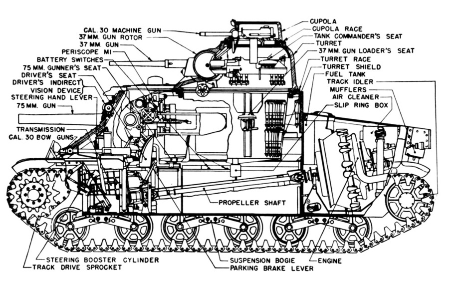 Отдельно стоит остановиться на столь обсуждаемой конструкции боевого отделения, а точнее, на его впечатляющих размерах. Американские конструкторы отнюдь не собирались делать внутри танка теннисный корт, причины появления столь громоздкого боевого отделения скрыты в его компоновке. Во-первых, части расчёта (наводчику и заряжающему 75-мм орудия) предстояло работать стоя. Вполне очевидно, что высота боевого отделения должна была обеспечивать нормальную работу расчёта. Отсюда и получилась большая высота корпуса танка. Во-вторых, большие размеры боевого отделения отнюдь не означали, что внутри много свободного пространства. По-настоящему много места было только у заряжающего 75-мм орудия, в остальных же частях танка оказалось довольно тесно. Значительную часть объёма боевого отделения занимали полик и ограждение башни.
