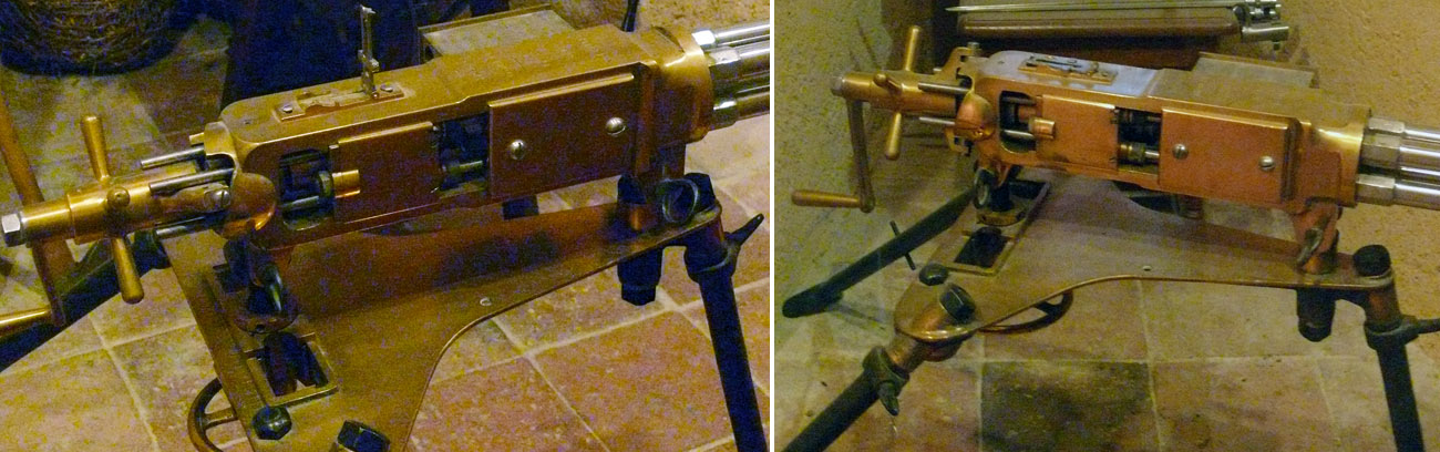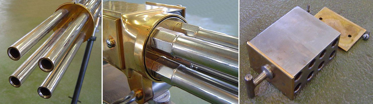 Для описания системы Габеров достаточно сказать, что боепитание этой четырехствольной митральезы осуществлюсь из несъемного магазина, емкостью всего 8 патронов! Вряд ли получится найти еще хотя бы один пулемет со столь малым боекомплектом. При этом перезарядка производилась вручную, по одному патрону, как в револьвере Нагана. Для этого имелся отдельный номер расчета.