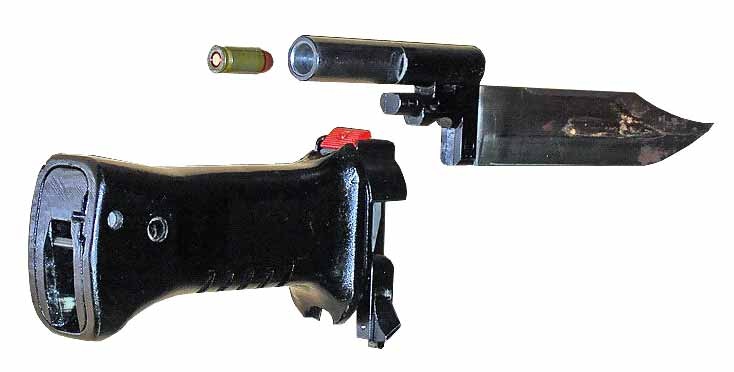 Стреляющее устройство выполнено таким образом, что его 9-мм ствол под патрон ПМ может быть заменен стволом под патрон другого калибра. Разработаны варианты стреляющего ножа под бесшумные(с отсечкой пороховых газов) патроны СП-2 или СП-3, 5,45х18 мм МЦП и 9х18 мм ПМ.