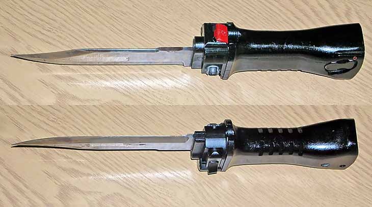 Спусковая клавиша под большой палец расположена впереди рукоятки над стволом. Для перезарядки клинок нужно извлечь из рукоятки.