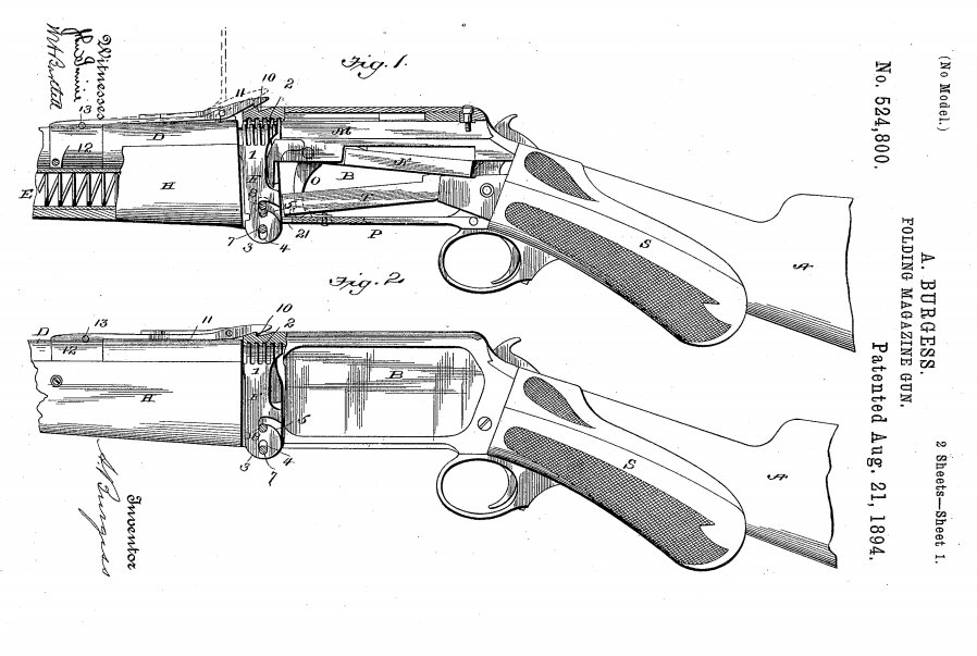Гладкоствольное ружье Берджеса “Burgess police gun” использовало оригинальный вариант помповой перезарядки. Вместо привычной всем перезарядки при помощи подвижного цевья, защищенной в тот период патентами американцев Спенсера и Ропера, Берджес применил перезарядку подвижной рукояткой, закрепленной на трубке, перемещавшейся по шейке приклада. Для перезарядки стрелку было необходимо убрать палец со спускового крючка и затем резко потянуть рукоятку назад, после чего вернуть ее вперед. Рукоятка связана проходящей понизу тягой с затвором, а также с подвижной крышкой, закрывающей нижнее окно в ствольной коробке. Запирание затвора осуществляется при помощи качающегося упора, шарнирно прикрепленного снизу. В переднем положении затвора задняя часть упора опущена вниз и упирается в выступ в ствольной коробке.