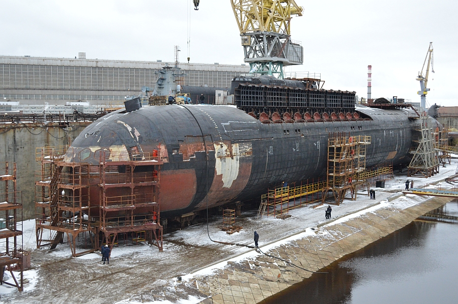 ПЛАРК К-266 «Орел» с открытыми щитами пусковых установок на СРЗ «Звездочка», зима 2013-2014 г.г.