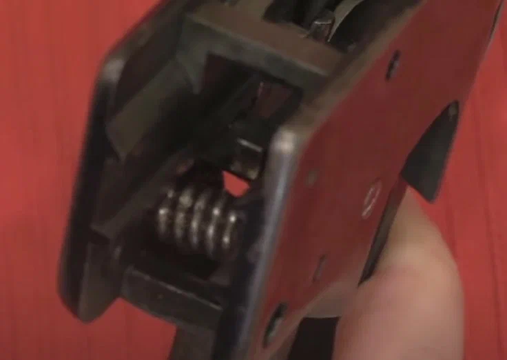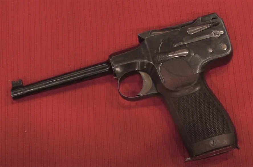 В пистолете были две пружины: одна, винтовая, управляла ударником, а вторая, торсионная (как на старых советских деревянных прищепках) принимала отдачу.