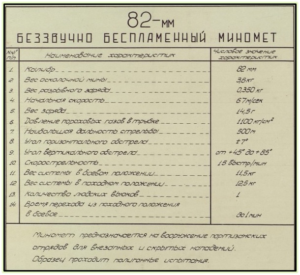 Миномет предназначен «для вооружения партизанских отрядов для внезапных и скрытных нападений, проводимых партизанскими отрядами». Беззвучно-беспламенный миномет имеет короткий ствол (фактически-направляющий стержень), заряжается посредством насаживания на направляющий стержень мины, оснащен ударно-спусковым механизмом. Компоновочная схема миномета — наиболее распространенный «мнимый треугольник», имеется опорная плита и двуногий сошник.